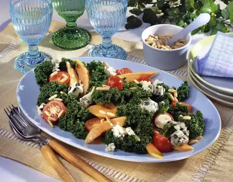 For the vinaigrette, whip mustard, honey and vinegar with the whisk of the hand mixer. Stir in 4 tablespoons mango juice and shallot. Also whisk the oil with the whisk of the hand mixer. Crumble the cheese. Carefully mix kale, cherry tomatoes and mango. Pour vinaigrette over it and mix. Arrange on a plate and serve sprinkled with pine nuts and cheese