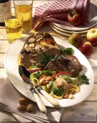 Stir in apple pieces and season to taste with salt, pepper and nutmeg. Chop almonds if necessary and roast them in a pan without fat until golden brown. Drain the spaetzle. Arrange meatloaf with spaetzle and vegetables.