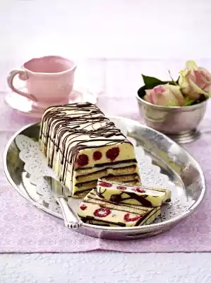 Put a little chocolate cream in a thin layer of about 0.5 cm on the bottom of the mould and cover it with raspberries. Cover the raspberries with a thin layer of chocolate cream and place a layer of biscuits on top. Cut a few biscuits into pieces (cut them into thirds or halves so that the biscuits lie close together as a layer in the mould). Spread another thin layer of chocolate cream on the biscuits. Repeat the process 3 more times until about 360 g biscuits and all the chocolate cream are used up. Finish with a layer of chocolate cream. Keep the mould cold overnight