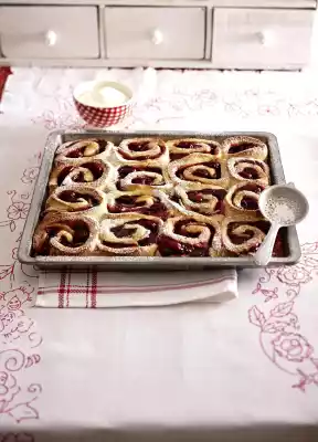 Cut marzipan into thin slices. Spread the cherry compote on the dough, leaving a 1 cm wide edge. Spread marzipan on the compote. Roll up the dough from the long side and cut into 20 slices. Grease a fat pan (32 x 39 cm). Place the slices with the cut surface in the fat pan and let them rise again for about 15 minutes in a warm place. Bake in the preheated oven on the middle shelf (electric oven: 175 °C/ convection oven: 150 °C/ gas: level 2) for approx. 30 minutes. Remove from the oven and let it cool down on a cake rack. Dust with icing sugar. Whipped cream tastes good with it