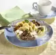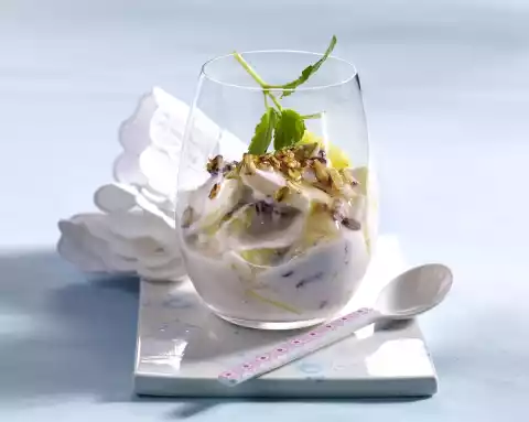 Arrange in a glass, sprinkle with oat flakes and sprinkle with honey. Decorate with lemon balm. Eat immediately.