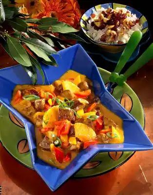Drain the pineapple, collect the juice and cut the slices into three. Clean, wash and cut the peppers into pieces. Clean spring onions and cut into fine rings. Peel garlic and press it through a garlic press. Cut the lamb into cubes. Heat the oil in a pot and fry the meat thoroughly. Add curry, cinnamon, cardamom, coriander, turmeric, ginger and garlic and stir-fry. Deglaze with stock and 1/8 litre pineapple juice. Add paprika and spring onions, except for 1 tablespoon, and braise covered for 20-25 minutes. In the last 5 minutes add pineapple and cook. In the meantime, put rice and some salt in 800 ml lukewarm water, bring to the boil and simmer for about 8 minutes at low heat. Turn off the stove and let the rice drip off briefly on a sieve. Melt 10 g fat in the warm pot, add rice, stir and let it simmer covered on the warm hot plate for 5-10 minutes. Stir the sauce thickener and crème-fraîche into the curry, bring to the boil again and season to taste with salt and cayenne pepper. Roast cashew nuts in a pan without fat. Finally add raisins and remaining fat and toss briefly. Put the rice in a bowl and add the raisin-nut mixture. Place the lamb curry in a bowl and serve sprinkled with the remaining spring onions