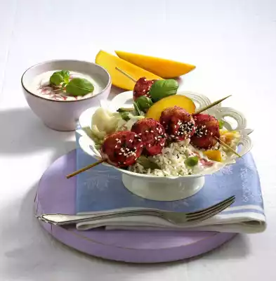 Cook in boiling salted water for about 5 minutes. Drain rice and cauliflower and mix with the spring onions. Drain mango and cut into cubes. Add to the vegetable rice and fold in carefully. Roll chicken strips into snails and put 3 snails on each skewer. Heat oil in a pan and fry chicken skewers in it for 8-10 minutes. Remove and sprinkle with sesame seeds. Mix yoghurt and salad cream. Mix half of the mixture with 1 tablespoon tandoori paste. Fold the tandoori salad cream in streaks into the remaining salad cream. Serve rice salad and chicken skewers together.
