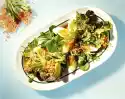 Heat oil in a pan and fry chicken skewers in it for 8-10 minutes. Remove and sprinkle with sesame seeds. Mix yoghurt and salad cream. Mix half of the mixture with 1 tablespoon tandoori paste. Fold the tandoori salad cream in streaks into the remaining salad cream. Serve rice salad and chicken skewers together. Garnish with basil if desired. Add the salad cream