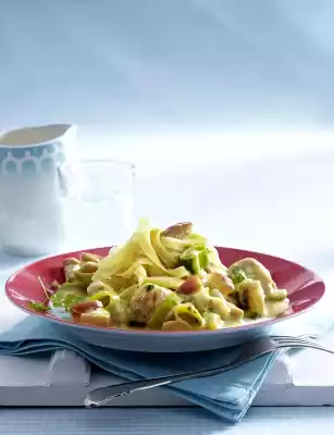 Heat the oil in a pan. Fry the meat for about 2 minutes, turning it over and season with salt and pepper. Add onion, leek and curry and continue to fry. After another 2 minutes, deglaze with stock and cream. Add apples and simmer for about 4 minutes. Bind with sauce thickener