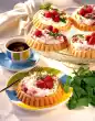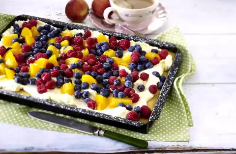 Mix quark, liquid cream and 75 g sugar with the whisks of the hand mixer. Add sauce powder and mix everything well. Spread on the cake base. Mix the fruits, spread on top and press a little into the cream.