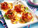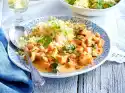 Meanwhile wash and quarter the tomatoes. Peel onions and garlic. Chop the onions coarsely. Cut garlic into wafer-thin slices. Add both to the sausage in the pan and fry briefly. Add the tomatoes and fry for about 5 minutes.