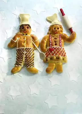 In a preheated oven. Bake from the bottom (electric oven: 175 °C/ circulating air: 150 °C/ gas: level 2) (check baking time and temperature!) for approx. 25 minutes. Leave the mare's kernels to cool down on the baking tray. Meanwhile knead marzipan and icing sugar and divide the mixture. Dust the work surface with icing sugar and roll out the two pieces of dough into a rectangle (approx. 8 x 5-6 cm). Then press the marzipan pieces with your hands into a chef's hat shape. Decorate cooled figures with sugar lettering. The girl gets a red and white checkered apron, the boy a brown and white checkered chef's trousers. In addition, you can now paint red mouths on both of them and the boy a white shirt and brown hair. Now stick the chef's hats with some white sugar writing on the two figures' heads and press them on. Border the edges of the chef's hats with white sugar writing. Leave to dry