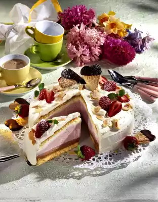 7-10 Tbsp Strawberries, ice wafers, toasted flaked almonds, lemon balm and icing sugar