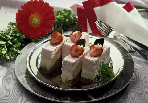 Cut the ice into thick slices. Whip the cream until stiff and fill into a piping bag with star-shaped spout. Decorate each piece with a cream dab, chocolate flakes and possibly a strawberry slice.