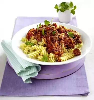Wash oregano, shake dry, remove leaves except for something to garnish, pluck from the stalks and chop. Prepare pasta in boiling salted water according to package instructions. Season minced sauce with salt and pepper, stir in oregano. Arrange noodles and minced sauce, garnish with oregano and sprinkle with pepper