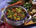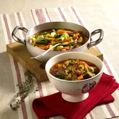 Skim off floating fat on top. Stir tomato paste into the stock. Cook the prepared vegetables for about 30 minutes. Remove bones from meat and, if desired, fat. Dice meat and put it back into the stew.