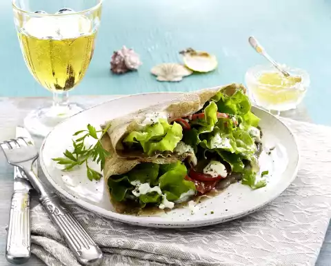 3) Spread one half of each pancake with crème fraîche, other halves with fruit spread. Cover the crème fraîche half with lettuce, tomatoes, cheese and parsley. Season with salt and pepper. Fold the fruit spread half over each, fold into a triangle and arrange. Garnish with the rest of the parsley