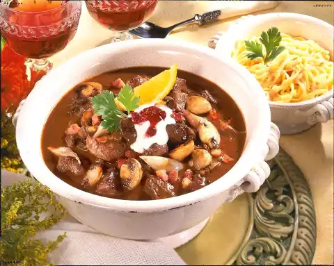 Deglaze with stock and red wine, bring to the boil. Add laurel, cloves, juniper and half of the cranberries. Cover and stew for 1-1 1/4 hours. Meanwhile cook spaetzle in plenty of boiling salted water for about 15 minutes. Pour onto a sieve, rinse briefly under cold water and drain. Foam up fat in a pot, brown breadcrumbs in it. Swivel the spaetzle in it. Stir the sauce thickener into the finished goulash, bring to the boil again briefly and season to taste with salt and pepper. Arrange in a bowl. Add crème fraîche as a blob and the rest of the cranberries. Garnish as desired with parsley and orange wedge. Add spaetzle extra