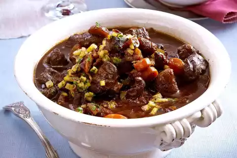 Add meat again. Dust with flour and sauté briefly. Deglaze with 3⁄4 l water. Season with salt, pepper, pimento, juniper and bay leaf. Bring to the boil, cover and stew for about 2 1⁄2 hours. After about 2 hours peel, wash and slice carrots and add to the meat.