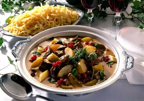 Add some mustard to taste. Season to taste again. Stir in a tablespoon of cranberries. Arrange the goulash in a terrine. Sprinkle with remaining marjoram leaves and garnish with remaining drained cranberries and the marjoram twig. Spätzle taste good with it