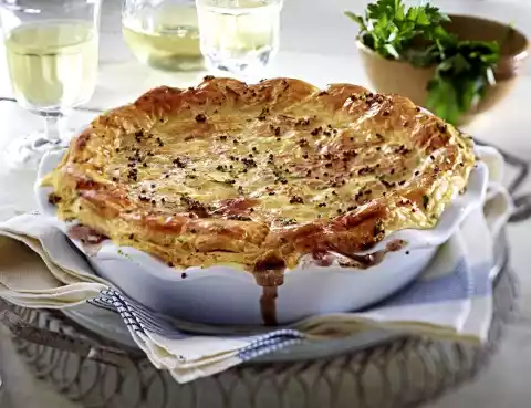 In the meantime, wash parsley, shake dry and chop finely. Mix mustard, parsley and egg yolk. Fill the game ragout into a pie dish (25 cm Ø). Take the puff pastry out of the fridge 5-10 minutes before use. Brush the edge of the pie mould with water. Place the pastry on top and cut off at the outer edge of the form. Press the dough on the edge. Brush with the mustard-egg mixture. Bake in the preheated oven (electric cooker: 200 °C/ convection oven: 175 °C/ gas: see manufacturer) for 30-40 minutes. Cover with foil after 20 minutes if necessary. Remove the pie from the oven and serve immediately