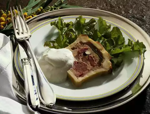 Spread the pâté on top and pour the sherry cream over it. As a drink a dry red wine, e.g. a Bordeaux fits very well.