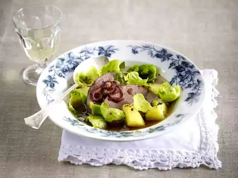 Remove the leg, cover with aluminium foil and let it rest for about 10 minutes. Chop the peppercorns, pimento and cardamom finely. Bring the stock and chopped spices to the boil and let them stand for about 30 minutes. Peel, wash and chop the potatoes and boil them in boiling salted water for 10-15 minutes until soft.