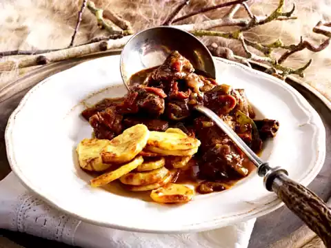 Dust the stifado with flour and sauté briefly. Deglaze with wine and 1⁄2 l water and bring to the boil. Cover and braise over medium heat for about 2 hours. Stir occasionally during the last 30 minutes.