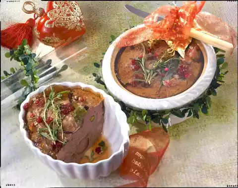 Fold the pistachios and mushrooms into the farce. Pour half of the game farce into 2 ovenproof tureen moulds (approx. 500 ml content each). Add the hare fillets and cover with the rest of the farce. Press on and garnish the surface with laurel, juniper, cloves and cranberries. Cover and bake in a preheated oven (electric cooker: 150 °C/ gas: level 1) for 60-70 minutes in a water bath. Then drain the meat juice. Let the terrines cool down in the refrigerator for about 2 hours. Soak gelatine in plenty of cold water for about 5 minutes. Heat the game stock, dissolve the squeezed gelatine in it and season to taste with the remaining sherry. Pour so much liquid onto the pâtés that the contents are completely covered. Leave to cool for approx. 24 hours and consume immediately