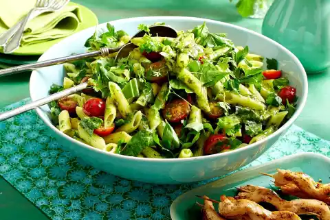 Wash and halve the tomatoes. Add the remaining herbs to the pasta. Season to taste with salt and pepper. Heat 4 tablespoons of oil in a large frying pan. Fry the skewers in it in portions all around for about 4 minutes. Arrange everything.