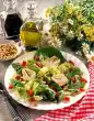 Clean the salad, wash and drain well. Pluck into bite-sized pieces. Clean and wash the cucumber, peppers, mushrooms and cherry tomatoes. Cut cucumber into thin slices, dice paprika. Halve mushrooms and cherry tomatoes.