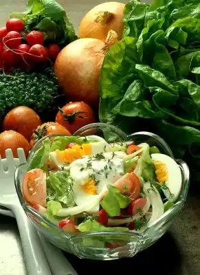 Clean and wash lettuce, tomatoes and radishes. Pluck lettuce into bite-sized pieces. Cut tomatoes into eighths and radishes into quarters. Peel and halve the onion and cut into thin slices. Cut the eggs into eighths. Mix prepared ingredients and sauce. Tastes good with grilled meat, sausages or garlic baguettes