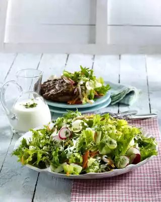 Then mix everything with the marinade. Arrange the salad on a large, deep plate and pour some cream sauce over it if necessary. Serve with neck steaks. Sprinkle the rest of the cream sauce with cress and serve separately.