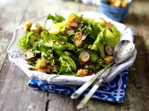 Take bread out of the oven. Mix the salad ingredients and serve.