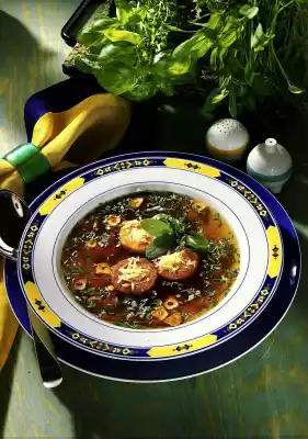 Peel and slice the garlic. Wash the herbs, dab dry and chop finely. Heat 10 g fat in a pot and sauté the garlic slices in it. Deglaze with the broth and add the herbs.