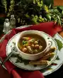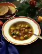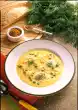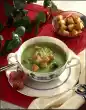 Season to taste with salt and pepper. Cut out round toast. Heat the remaining fat in a pan and fry the slices of toast until golden brown. Take them out and sprinkle the cheese over them. Arrange the soup in plates and add the croutons.