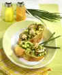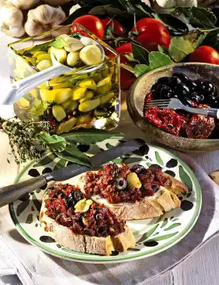 Drain the olives well on a sieve. Also drain the tomatoes. Peel garlic and chop very finely. Cut 2 olives into slices. Chop the tomatoes and the rest of the olives very finely.
