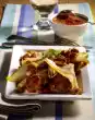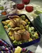 Sprinkle with olive oil, salt and pepper. First cook in the preheated oven (electric cooker: 200 °C/ gas: level 3) for 40 minutes. Turn vegetables 1-2 times. In the meantime, wash and halve the tomatoes. Wash and chop the herbs. Peel garlic and press it through the press. Pour 200 ml water over the chicken. Add the tomatoes. Spread chopped herbs and garlic on the vegetables and chicken.