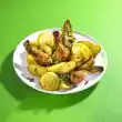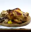 Wash the chicken, dab dry and tie with kitchen string. First season with salt and pepper. Wash and halve the potatoes. Peel the shallots. Spread the chicken and prepared vegetables in a large roaster.