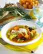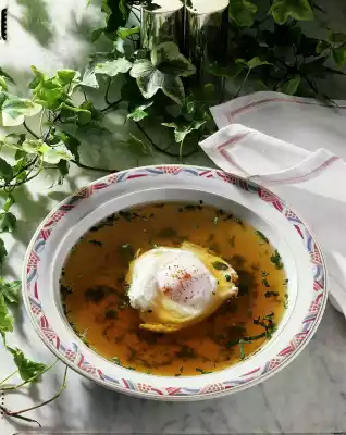 Peel and slice the garlic. Wash herbs and chop finely. Heat beef stock, garlic and herbs. Boil up about 1 litre of salt water and vinegar. Let the egg slide in carefully.