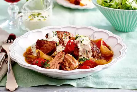 For the goulash, wash the tomatoes, add them to the meat and braise for about 15 minutes. Wash parsley, pluck off leaves, chop and add. Season goulash with salt and pepper. Serve with some mint yoghurt. Serve with the rest of the yoghurt sauce and flatbread.