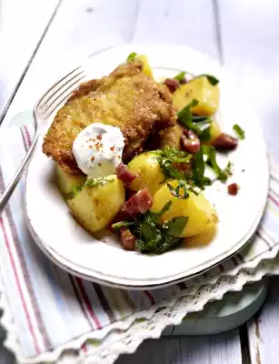 Melt the garlic butter in a pan. Add potatoes and bacon and fry over medium heat until golden brown. Turn escalopes first in egg, then in parmesan crumbs. Heat oil in portions in a frying pan, fry half of the escalopes on each side for 2-3 minutes, keep warm. Fry the remaining escalopes in the same way.
