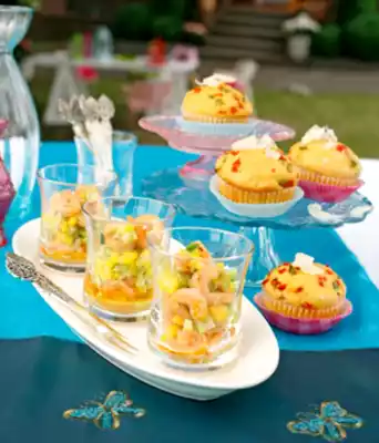 Wash the prawns, dab dry. Heat 2 tablespoons of oil in a frying pan. Fry the prawns for 3-4 minutes, season with salt, pepper and paprika and let them cool down. Clean, peel and halve the cucumber. Remove seeds. Cut cucumber into small cubes. Peel mango, cut flesh from stone and dice.