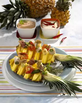 Quarter the pineapple, remove the hard stalk in the middle. Cut the flesh from the skin. Cut crosswise into thick slices and arrange them offset on the peel. Place the prepared ingredients alternately on the pineapple slices with skewers. Add the dips in small bowls