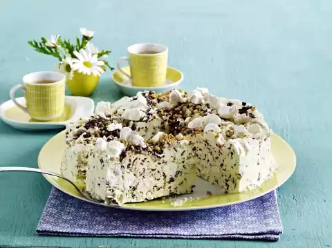 Set aside some brittle, meringue and chocolate, fold the rest into the cream mixture. Line a springform pan (26 cm Ø) with baking paper. Pour in the mixture and spread loosely. Sprinkle with the ingredients set aside. Cover the baking tin and put it in the freezer overnight. Take out 10 minutes before serving. Remove from the mould and serve immediately
