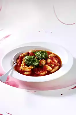 Add the beans to the tomato sauce about 10 minutes before the end of the cooking time and cook until done. Season to taste with salt and pepper. Serve with 2 herb dumplings each.