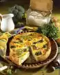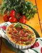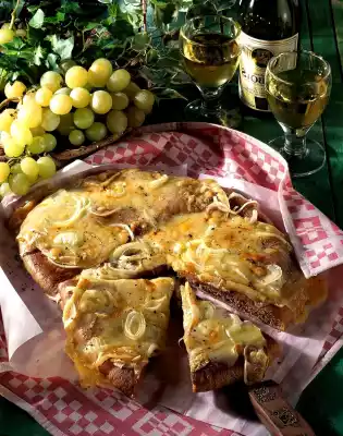 Peel the onion and slice into rings on the vegetable slicer. Roll out bread dough on a floured work surface in an oval shape (34 x 25 cm). Place on a baking tray lined with baking paper. Spread onion rings on the dough.