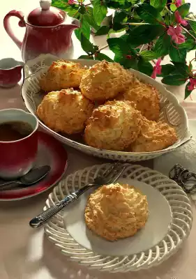 Pour the coconut mixture into a piping bag with a large star-shaped spout. Spray 8 heaps of coconut mass onto the baking tray at a large distance. Bake in the preheated oven (electric cooker: 150 °C/ gas: level 1) for 25-30 minutes. Results in 8 pieces
