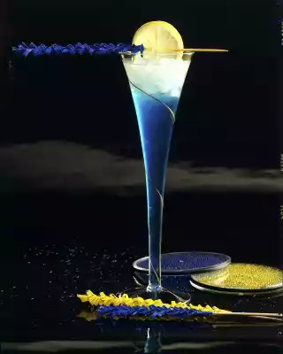 Pour Curaçao blue over it. Put a slice of lemon on a colourful cocktail stick and serve immediately.
