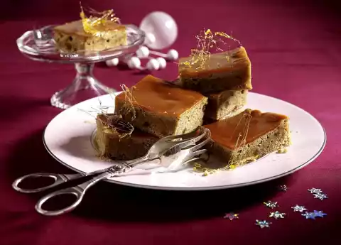 Pour the caramel onto the cake and spread it immediately with a pallet. Let the cake cool down for about 30 minutes, then cut it into squares with a damp knife. Before serving, caramelise 4 tablespoons of sugar, then allow to cool until the caramel has a syrupy consistency. Crumple the baking parchment slightly and use a spoon to run the caramel in strips on the baking parchment. Leave to cool and remove from the paper (caramel will break). Decorate cake with caramel