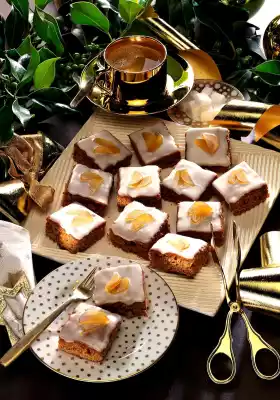 Finely chop the remaining fresh ginger or press it through a garlic press. Mix icing sugar, ginger, lemon juice and 1-2 teaspoons of ginger syrup to a smooth glaze. Spread on the gingerbread and cover with ginger plum slices at regular intervals.