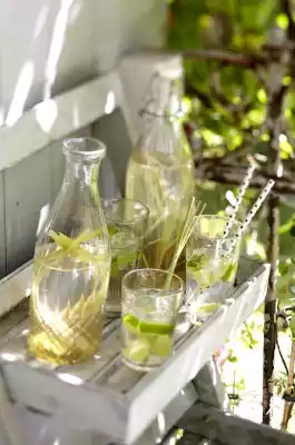 Wash the limes hot, dry them and dice them roughly. Pour mineral water over the ginger-sugar water and add the limes. Serve in glasses with ice cubes.