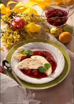 Fold in ginger sticks. Pour into a saddle of venison dish. Let it freeze for at least 4 hours, preferably overnight. For the cherry sauce, drain the cherries on a sieve. Boil up the juice, cinnamon stick and sugar.