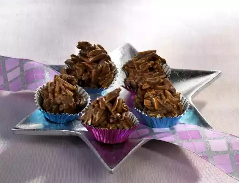 Coarsely chop the chocolate coating and melt it in a hot water bath. Melt the sugar in a pan. As soon as the sugar becomes brownish, add almonds and roast while stirring. Stir the gingerbread spice into the couverture. Add almonds to the chocolate coating and stir. Form 30 heaps on baking paper with the help of 2 teaspoons. Leave the almond slivers to dry for 2 hours and place them in small praline cups